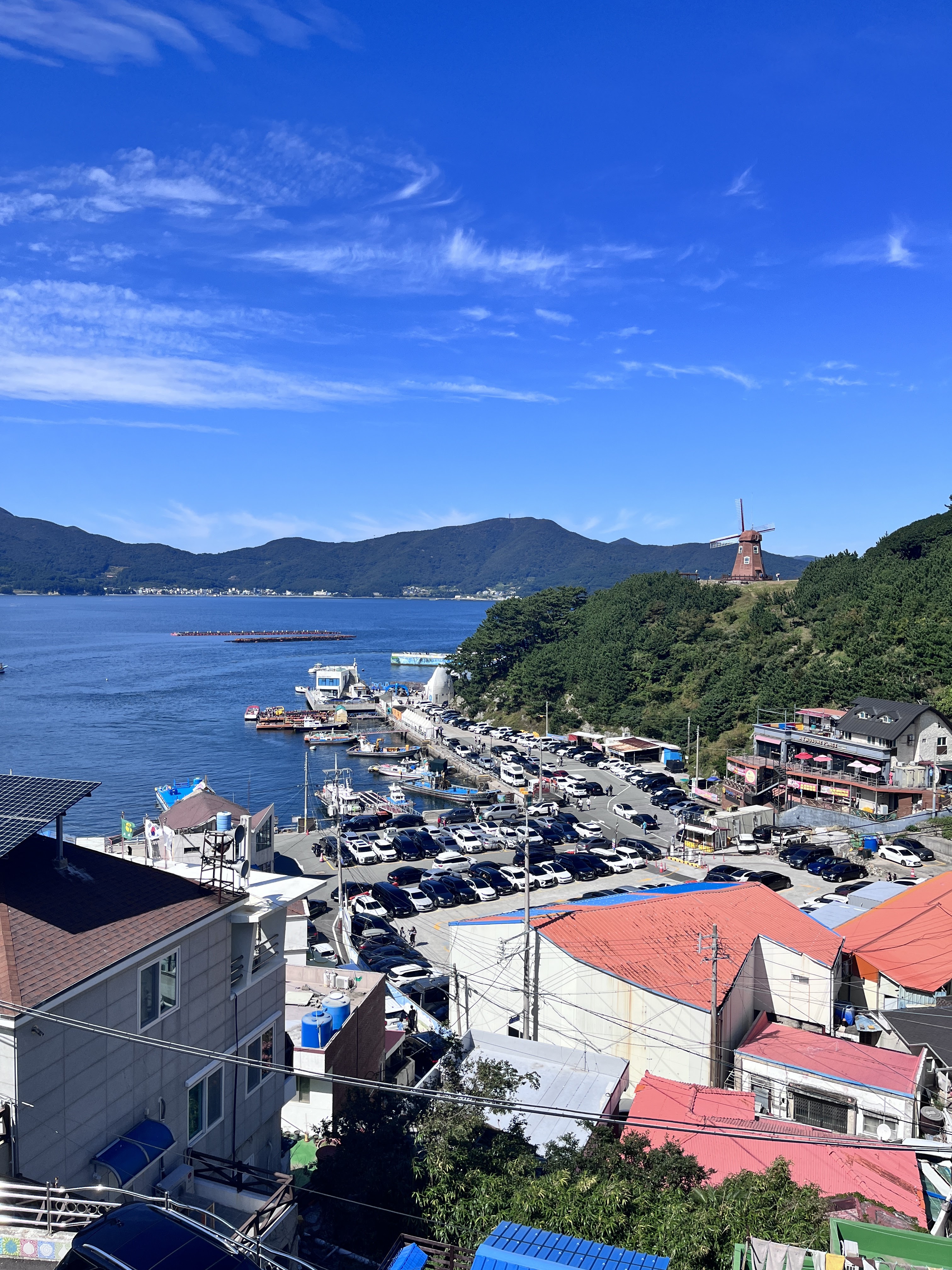 位於慶南巨濟的「風之丘」是一座三面環海的小山丘,因時有海風吹拂,在此生長的植物亦受生態環境影響,大部分的植物皆屬矮小型。山丘上還有一座面朝大海的荷蘭式風車,風車於2009年竣工,是這座小山丘的標誌性建築,在「風之丘」上可看到壯麗的南海和陶藏浦村的村落風景,充滿浪漫和異國情調,令人彷彿來到歐洲的一座小山上,放眼望去,不覺心曠神怡。陶藏浦村、陶藏浦港離古縣巴士轉運站,約有一個多小時的公車車程,通常這裡不是第一個巨濟旅遊的行程,但因為鄰近風之丘以及其他景點,也使得這裡人氣居高不下,雖然巨濟島公車路線不多且不複雜,但班次實在太少,主要路線一天約只有6-10班,因此我還是強烈推薦參加一日遊比較方便,其次就是自駕遊了。