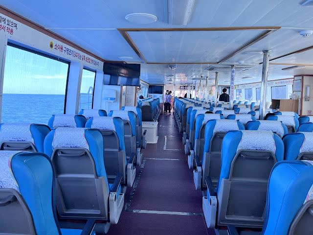 因為不少韓國人也會來這裡搭船到其他島嶼與外島,船票很容易就銷售一空,如果方便的話,可以先網路上購票,或是一大早就去現場買好票後,再進行其他行程。這就是我們要乘搭的船,座位頗多,有兩層,不過上層供觀賞海金剛時使用,下層才是位置。